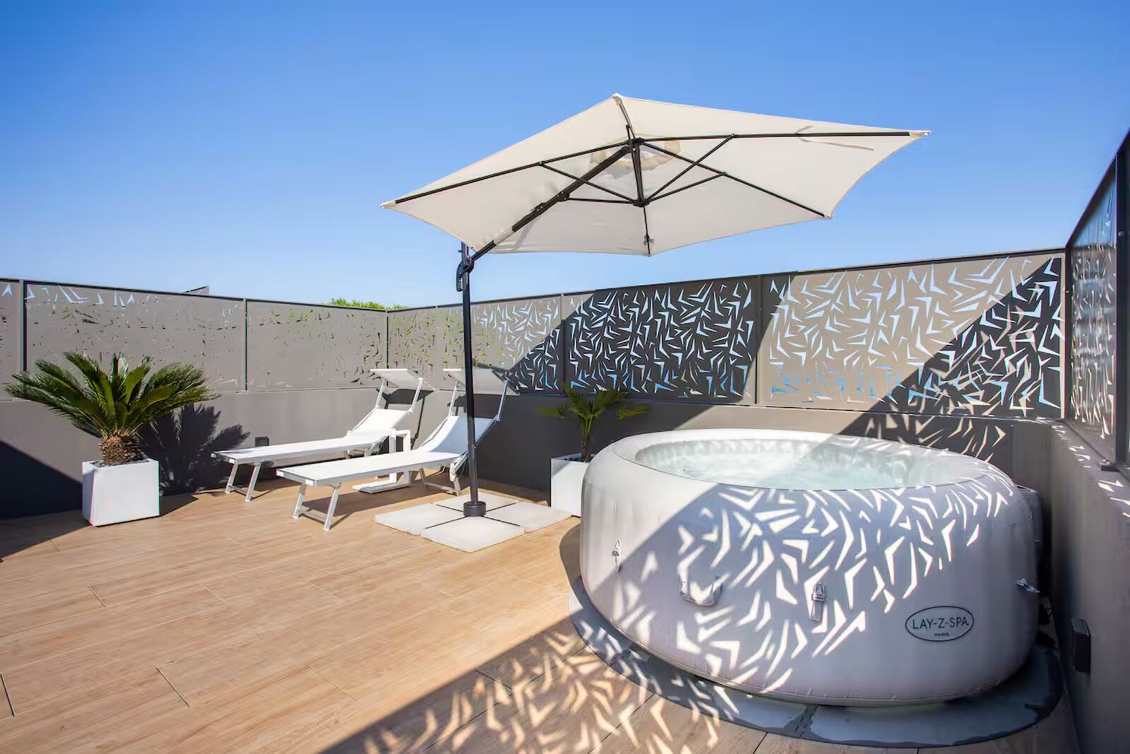 See more photosLess than 15 minutes from Nice Airport, this rental apartment in Villeneuve-Loubet has a private rooftop with a hot tub. As a studio, the loft has a lounge area with a television, a king-size bed, and a fully-equipped kitchen. The communal pool overlooks the Mediterranean Sea (be sure to check out the sunset from here at least once) and the compound has direct access to the beach.