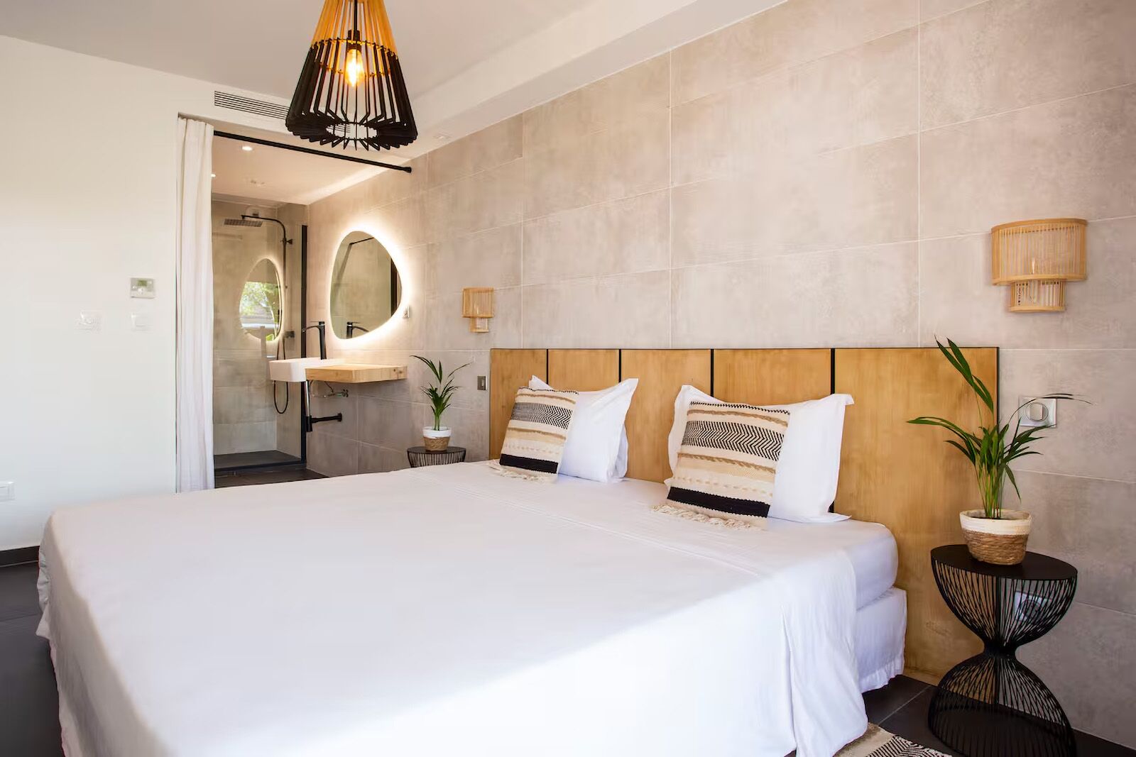 Outside there’s a small vegetable patch, an outdoor shower room (perfect for washing down snorkeling gear and wetsuits), and a lovely terrace with a table and chairs which is surrounded by greenery. Thanks to its large windows and positioning on the hillside, the interior is light and airy with white walls that keep the villa cool in the summer months.