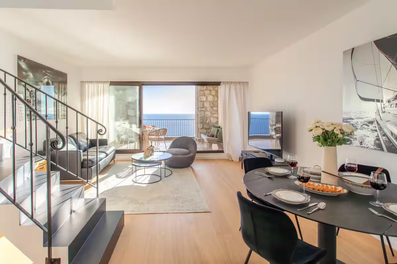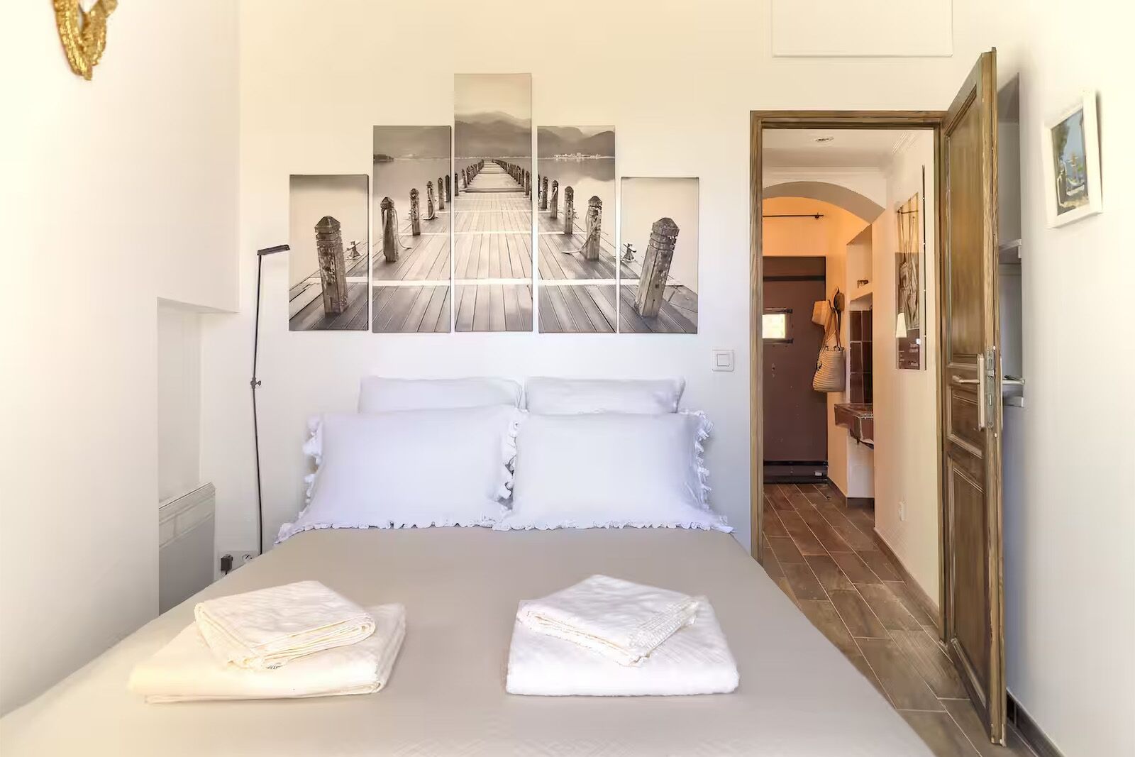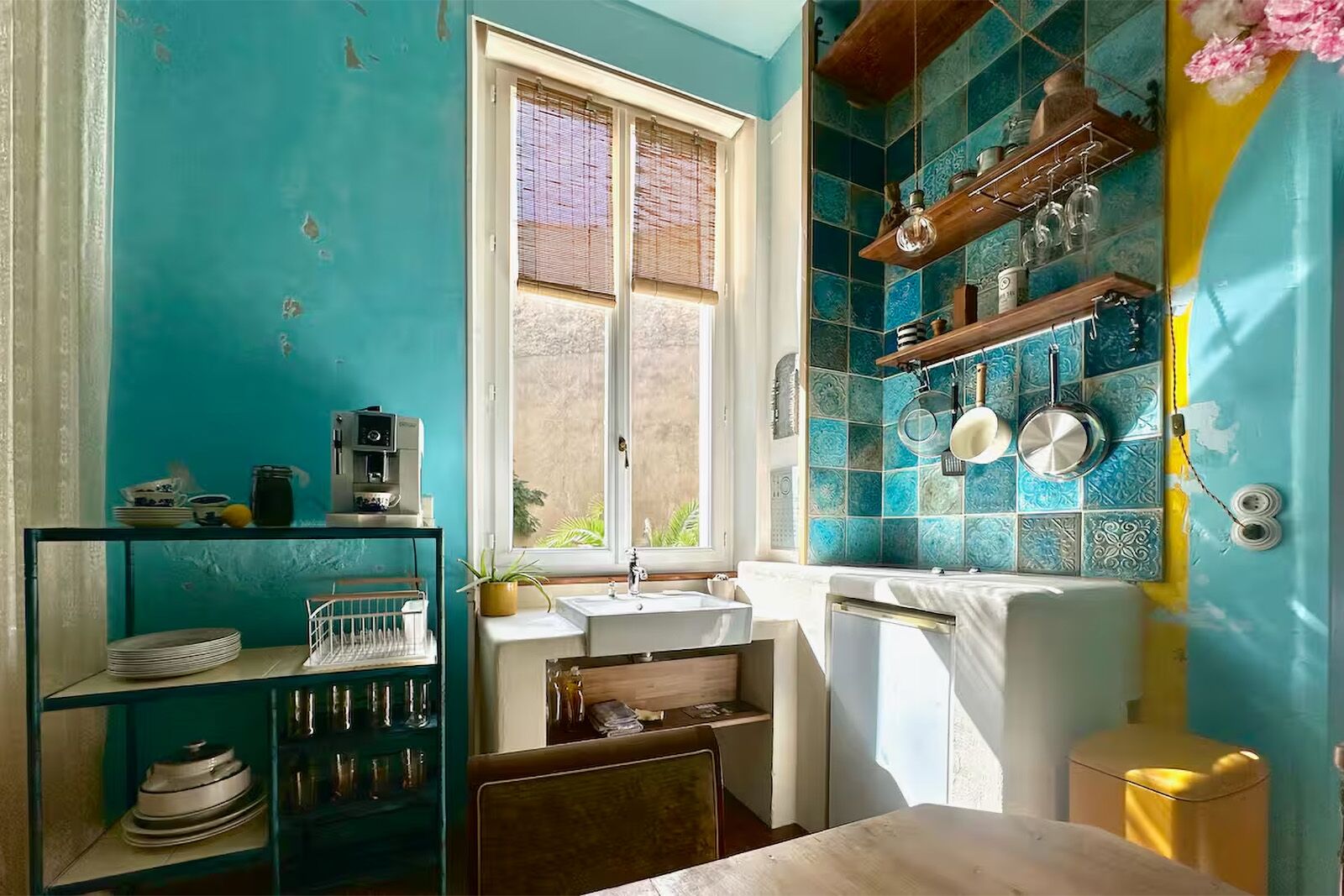 Perched between the red-tiled roofs, this charming two-bedroom loft is an Airbnb Plus rental that is perfect for a small family, couple, or solo traveler. On the top floor, there is an open-planned mezzanine bedroom and there is another beautifully decorated second bedroom on the ground floor. From the soft blue pastel color pallet, use of wood paneling, and driftwood artwork, the decor has a nautical theme throughout. Outside there is a cute terrace with a seating area, succulents, and views over the houses near Vieux Port.